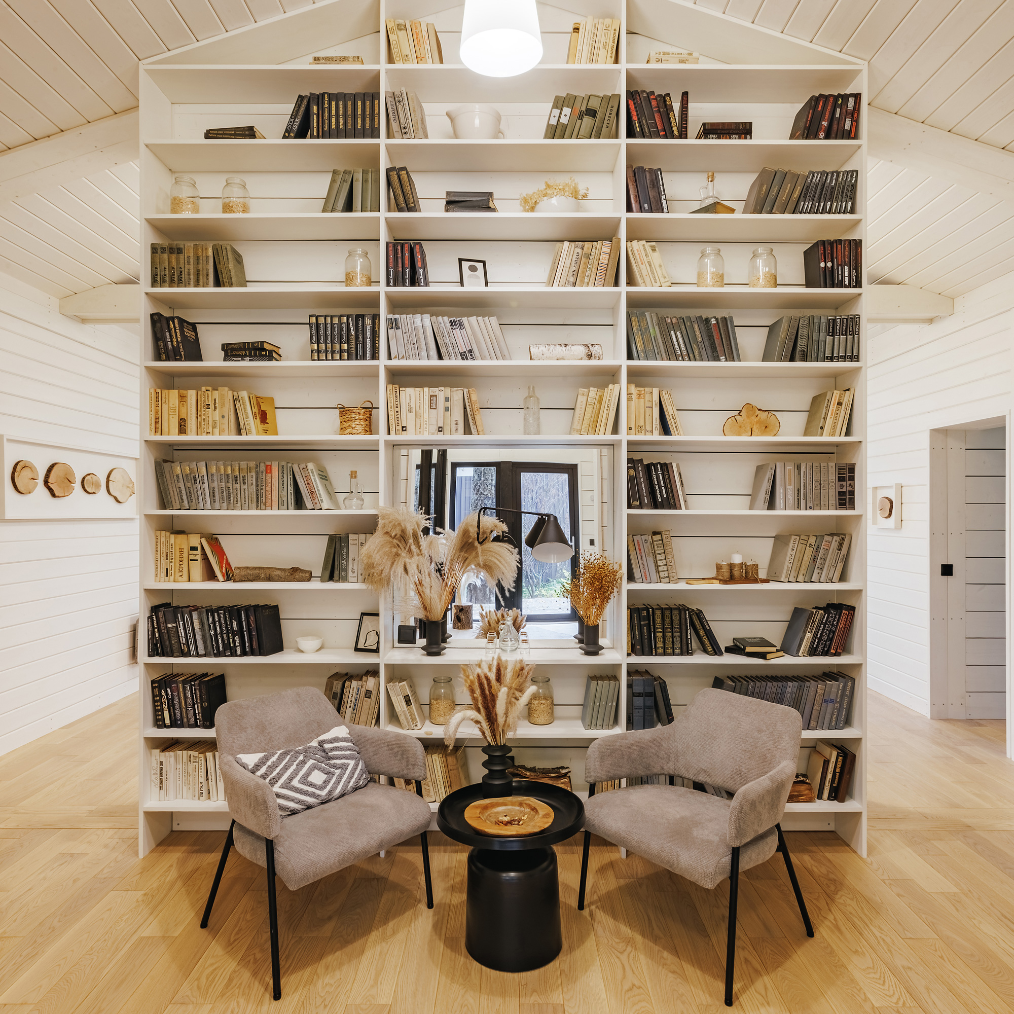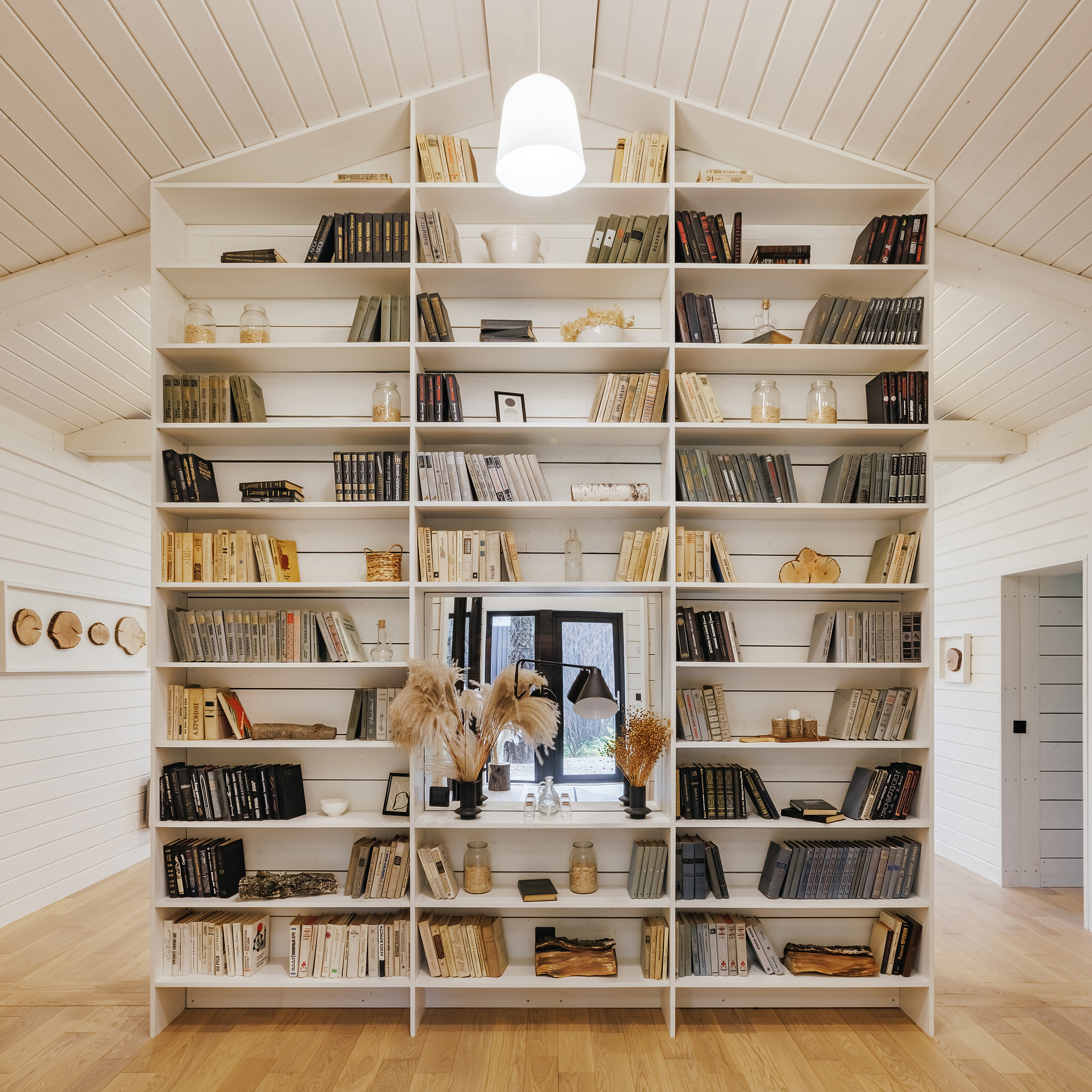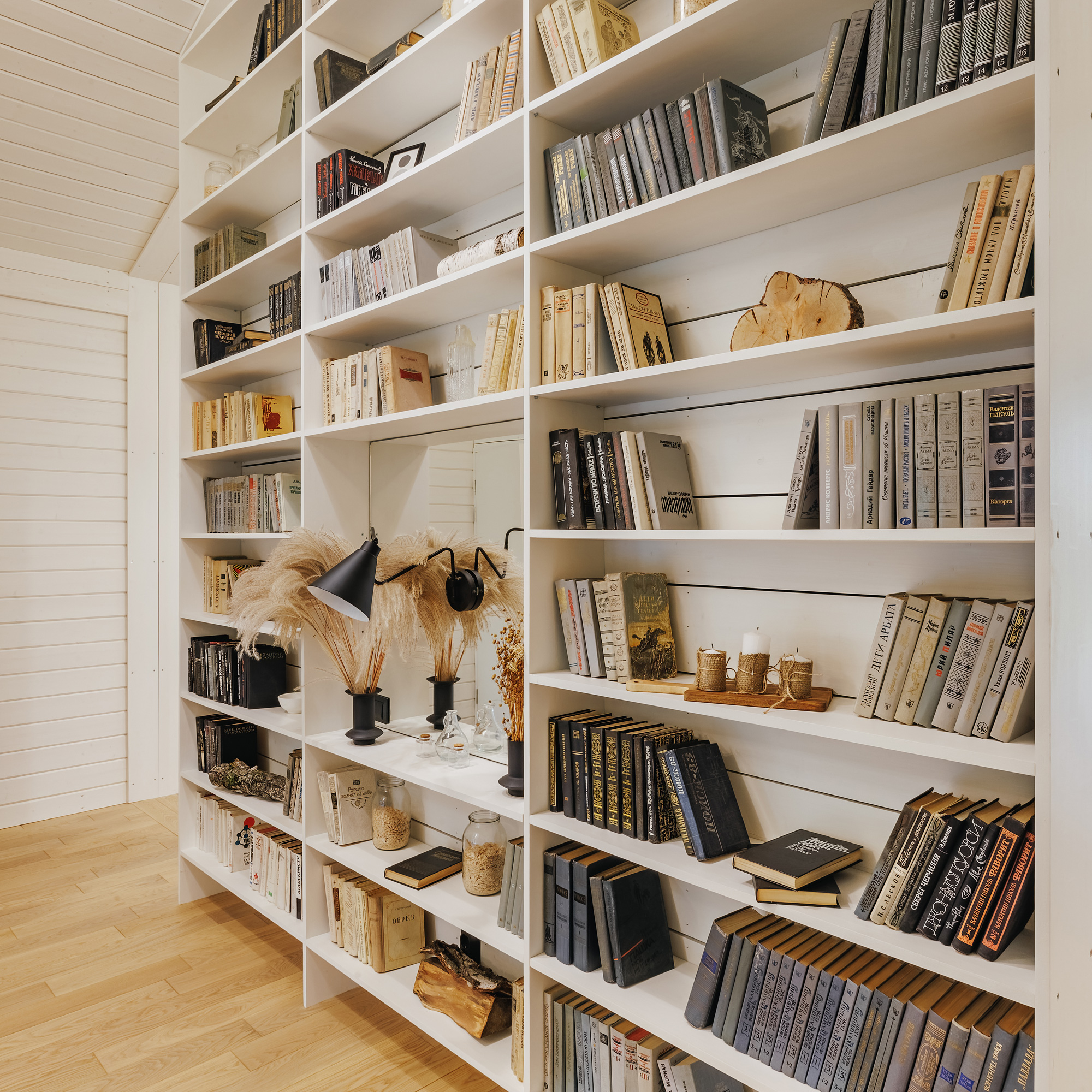 Открытая система хранения позволяет разместить большую коллекцию книг и декора, сохраняя при этом ощущение "воздуха" и визуальной легкости.